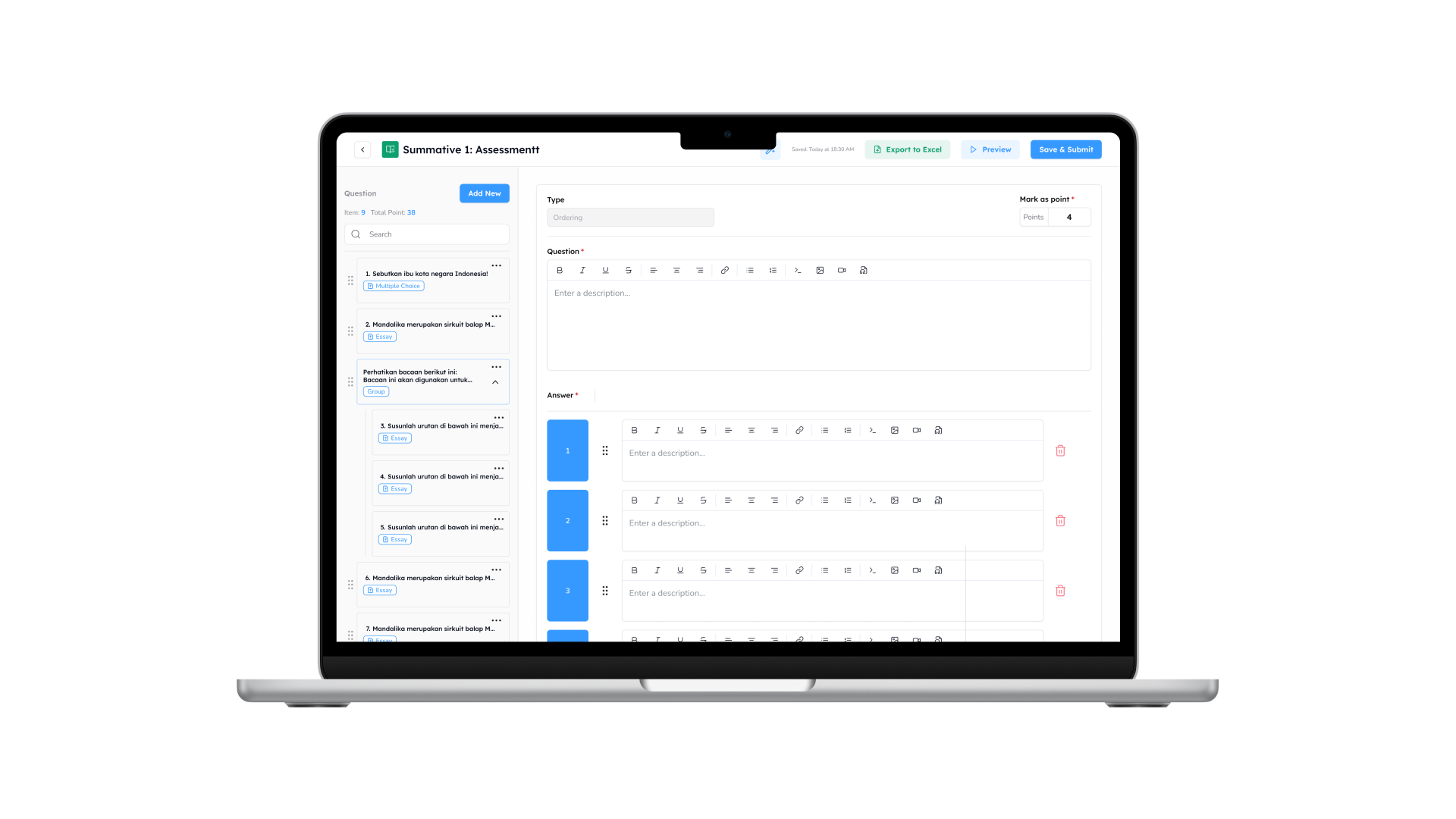 Penyusunan soal tidak harus memakan waktu panjang. LE Assessment memberi ruang bagi guru untuk membuat soal sesuai kebutuhan pembelajaran. Dengan antarmuka yang sederhana, guru dapat fokus pada kualitas soal.