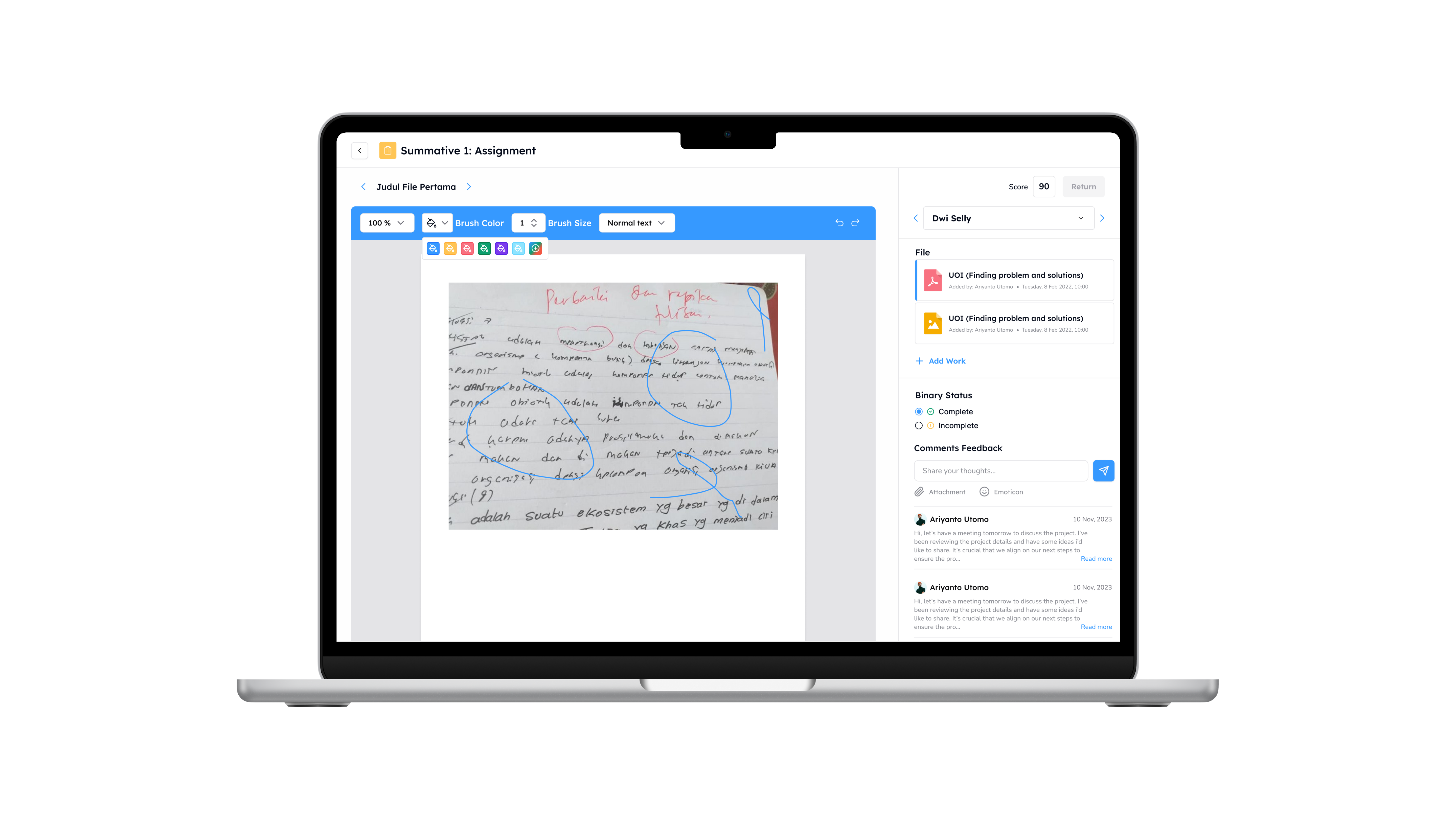 Anotasi dapat ditulis langsung pada file, seperti saat mengoreksi di kertas. Untuk tugas latihan sederhana, tersedia status biner complete atau incomplete yang bisa diberikan dengan cepat. Sementara untuk penilaian yang lebih mendalam, guru dapat menggunakan rubrik sekaligus menambahkan komentar personal agar murid memahami kekuatan dan area yang perlu diperbaiki.